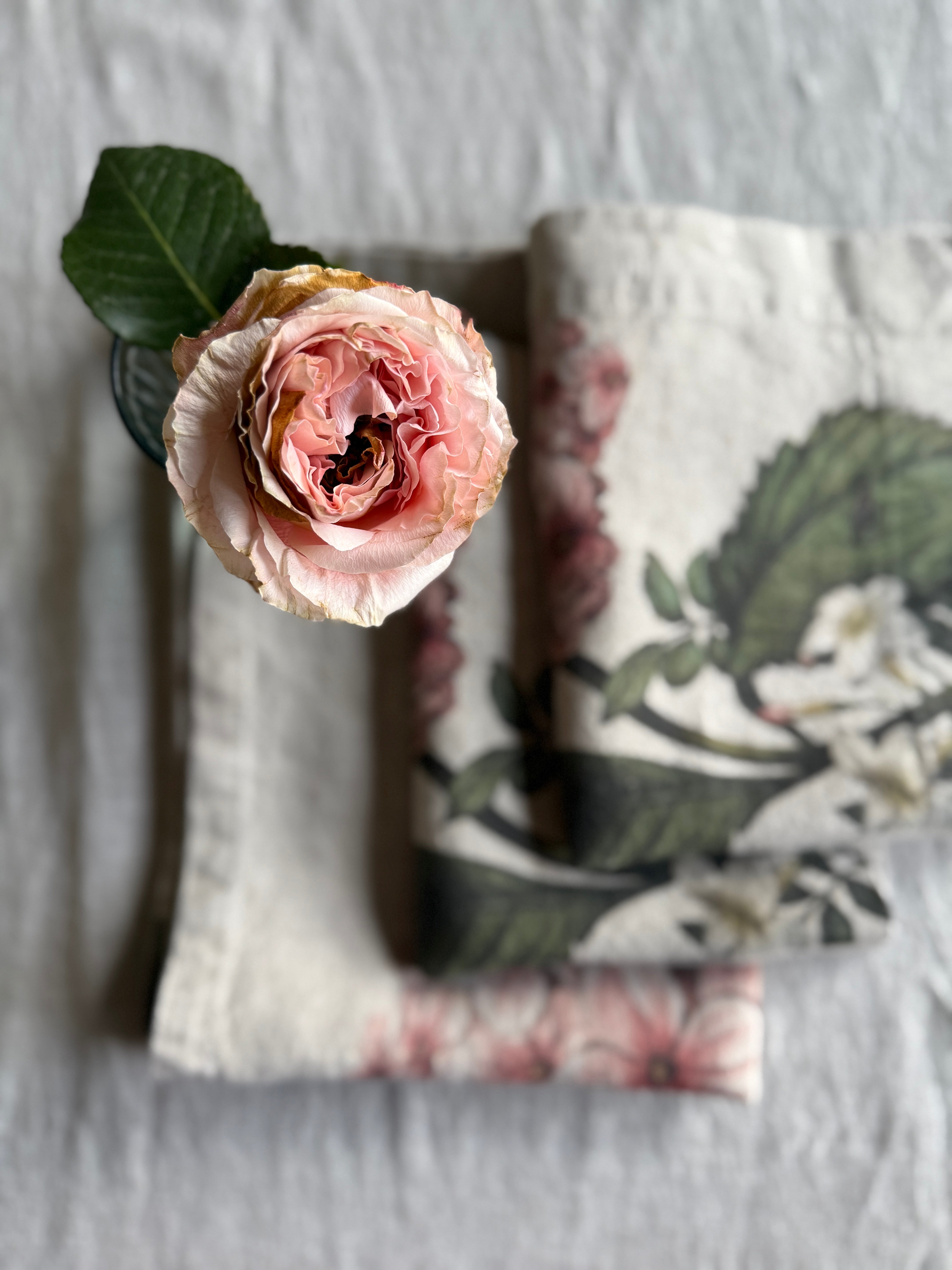 Printed with flora and fauna on undyed linen it's the perfect piece for indoor or outdoor tables where you want to invite nature's transforming vibes to the table.