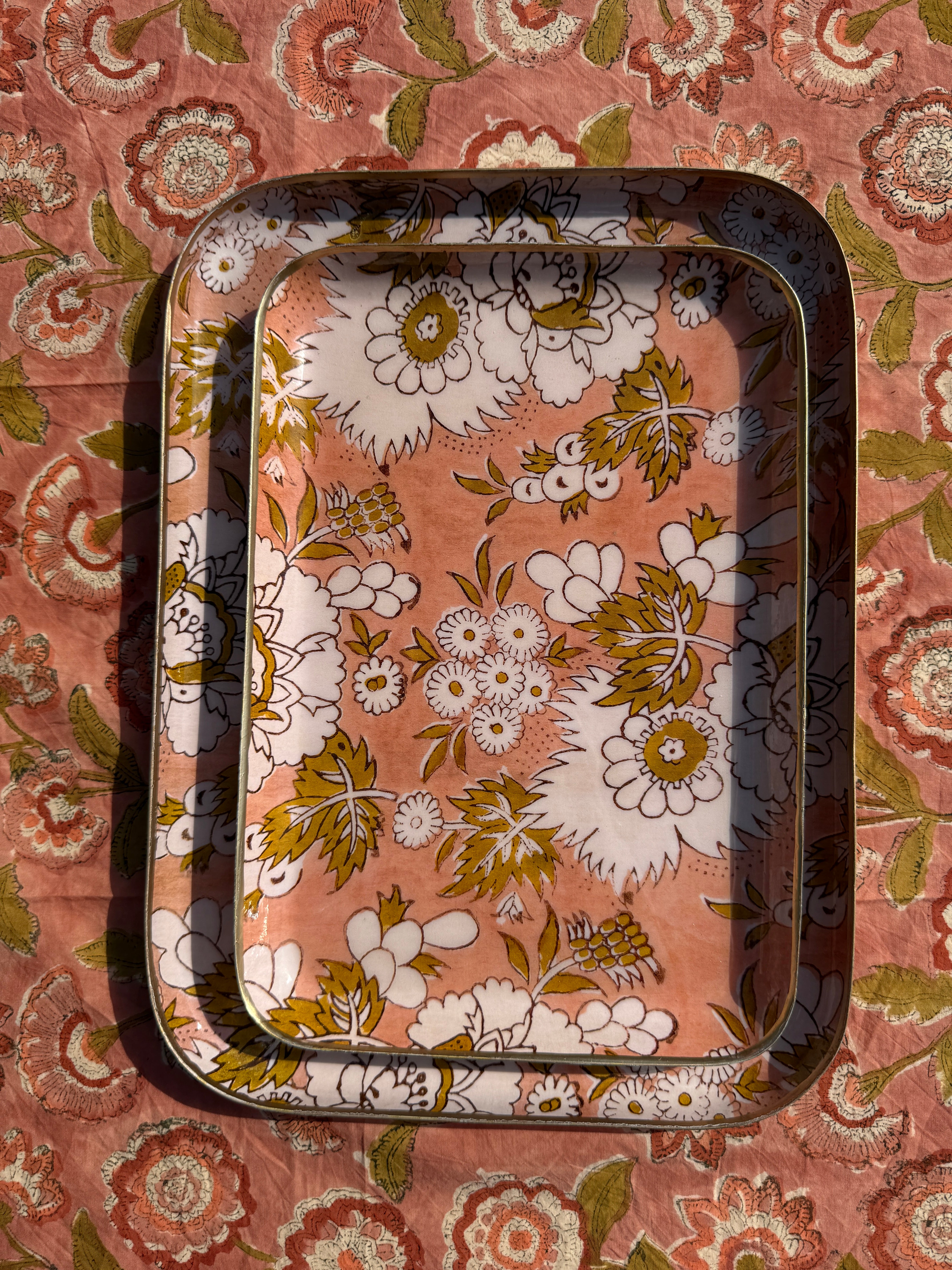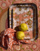 Colorful optimism in a floral tray in enamelled in metal for longevity. Crafted in a fashionable palettes this mid size model will accompany you during celebratory moments, aperitif, breakfast, and dinner with friends. A practical size for snacks, coffees, afternoon treats.