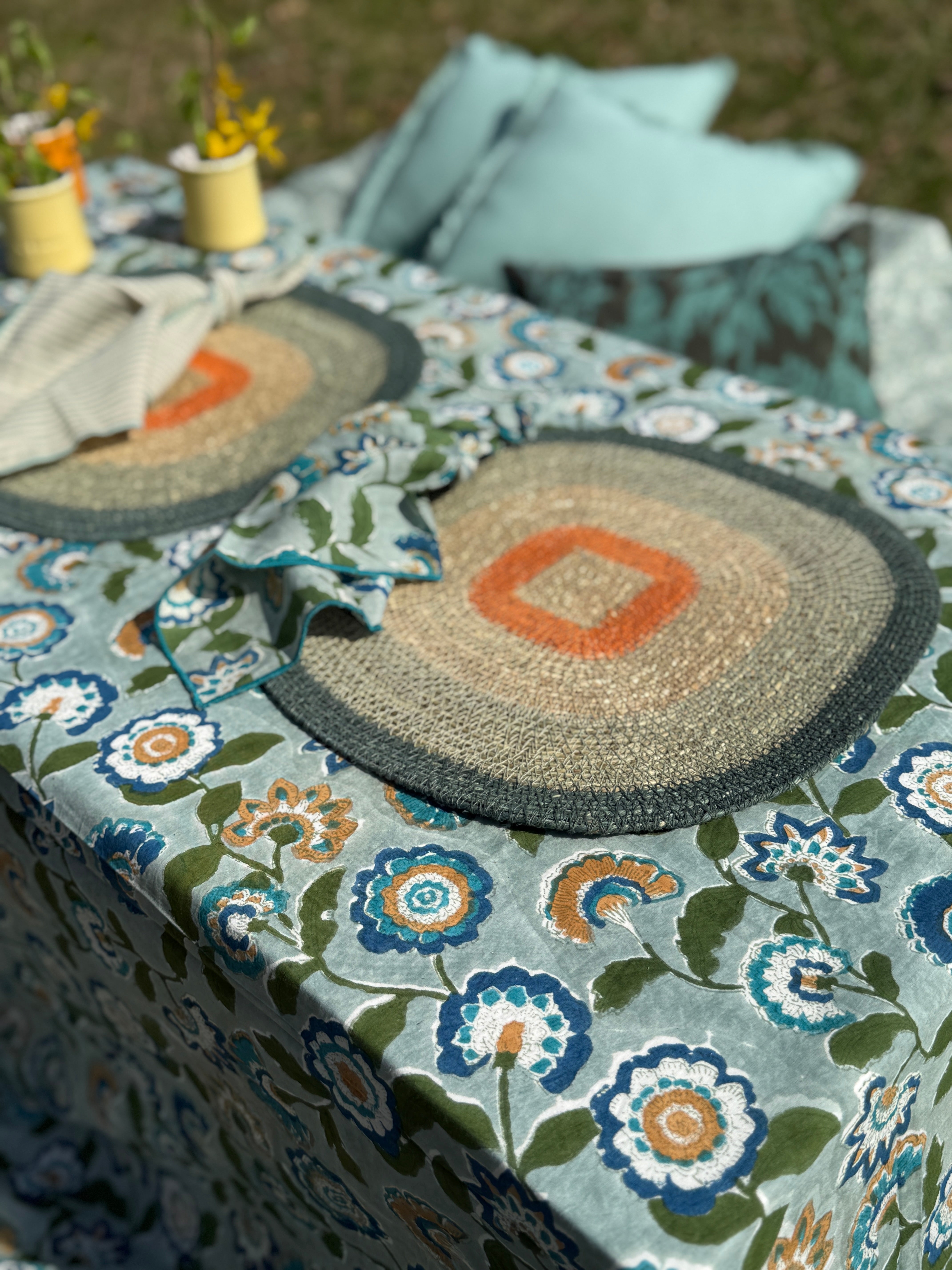 This easy care cotton tablecloth will instantly transform a table into an joyful spot with its warm color palette. Block printed by hand with sweet detailing it's a piece that you can easily carry wherever you go and create a space that feels like home in seconds.