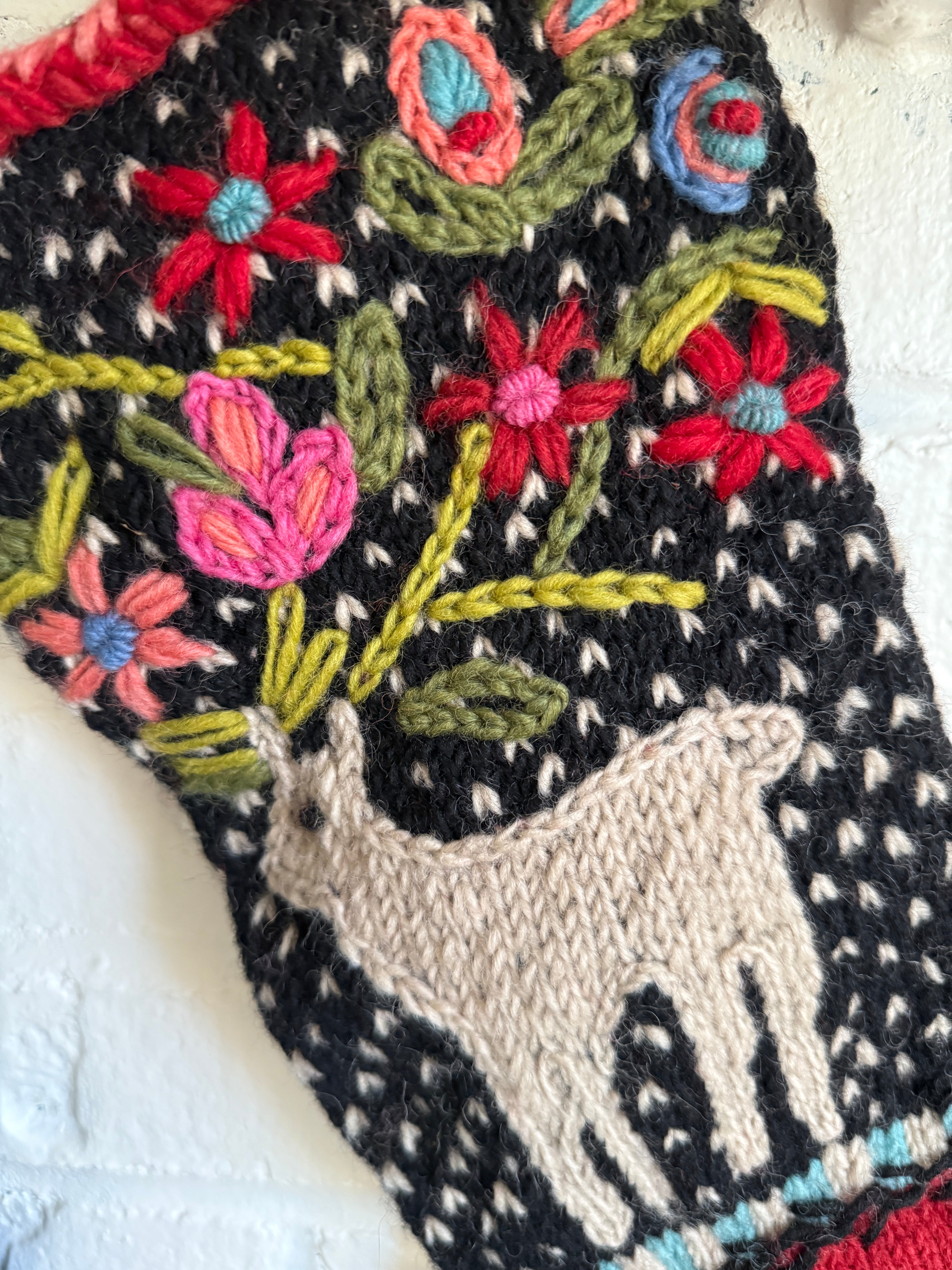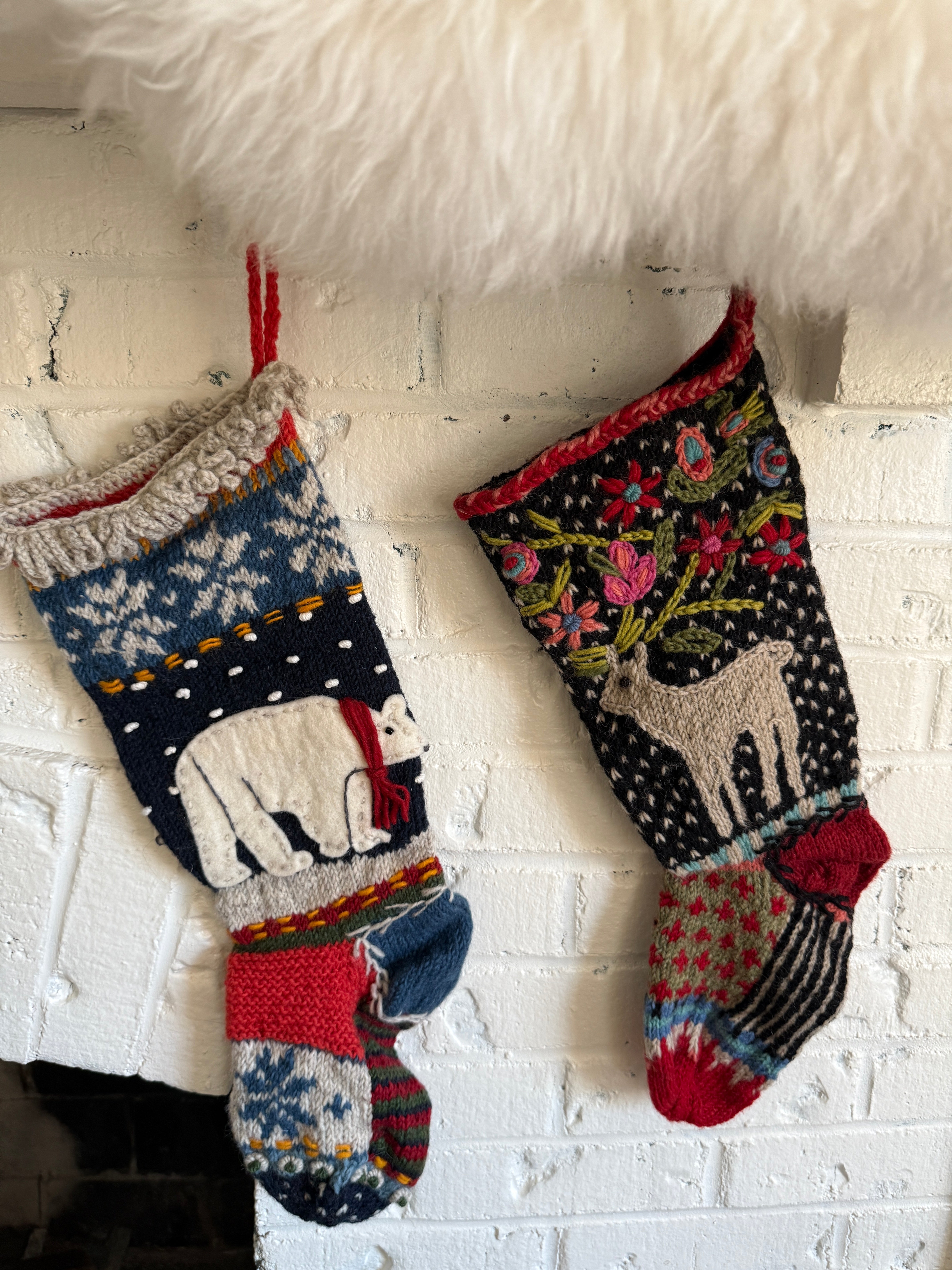 A loopy wool cuff and red hanging loop complete this festive, hand-touched design. Each North Pole stocking is handmade by women artisans in Nepal, supporting Fair Trade practices and helping preserve traditional appliqué and knitting techniques.