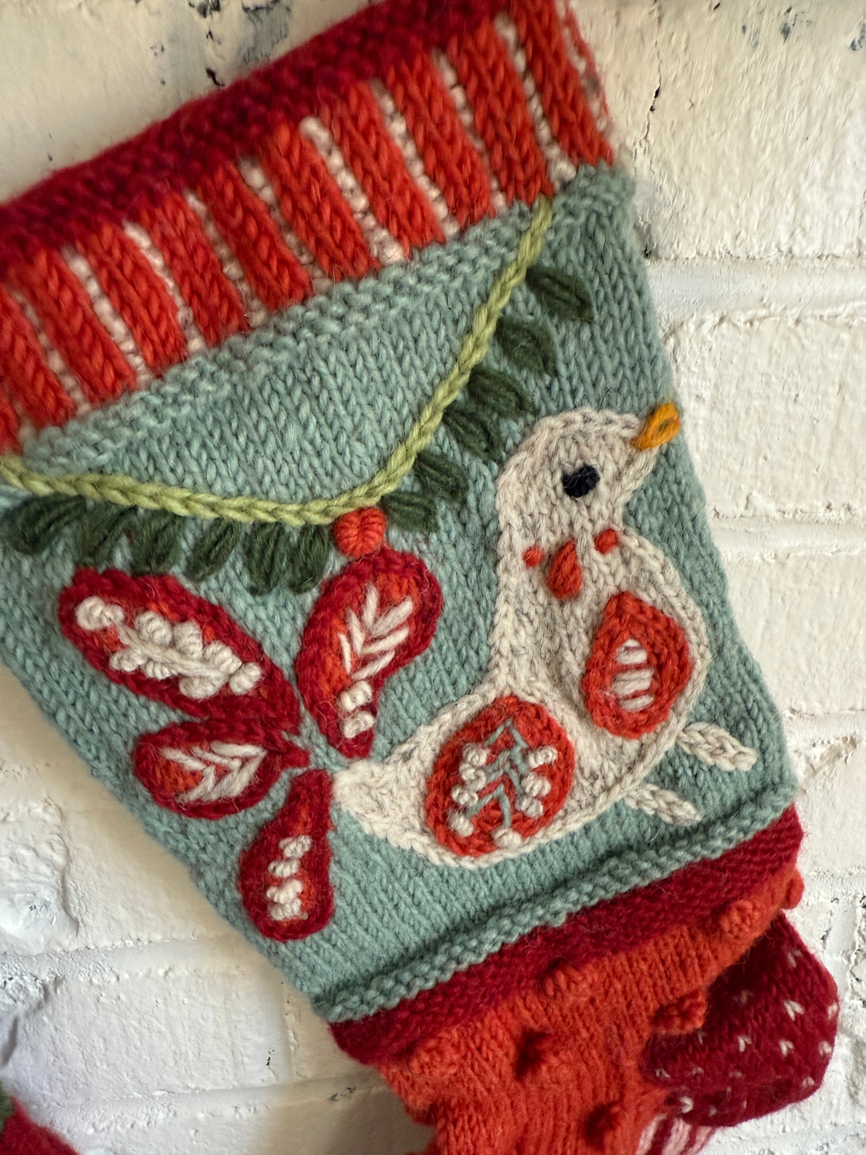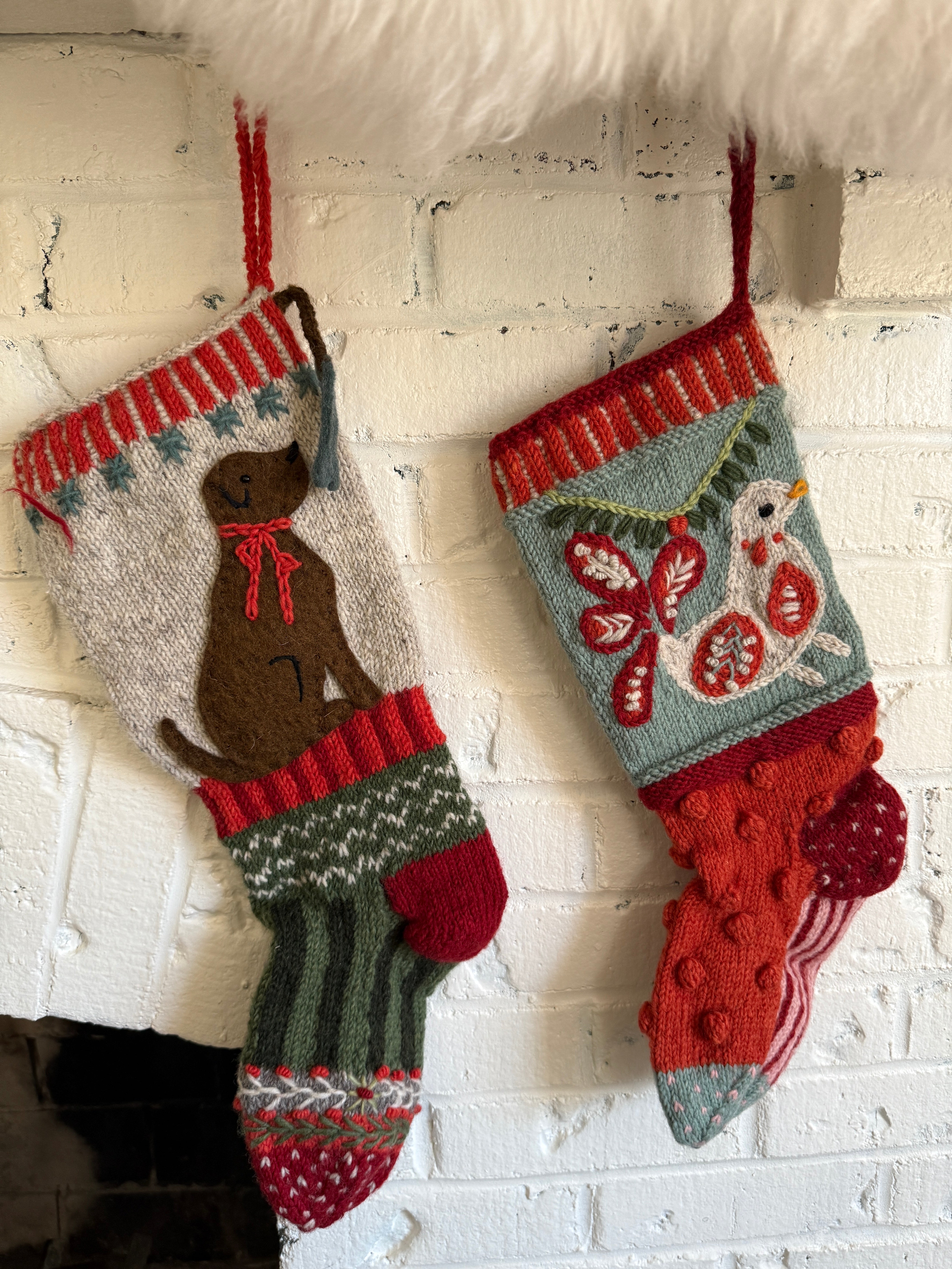 A loopy wool cuff and red hanging loop complete this festive, hand-touched design. Each North Pole stocking is handmade by women artisans in Nepal, supporting Fair Trade practices and helping preserve traditional appliqué and knitting techniques.