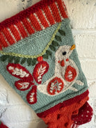 The North Pole stocking captures the wonder of winter with playful knitted detail and cozy texture. A felt appliqué dog/bird with a red scarf stands out against a snowy knit backdrop, framed by stripes and colorful patchwork foot accents.