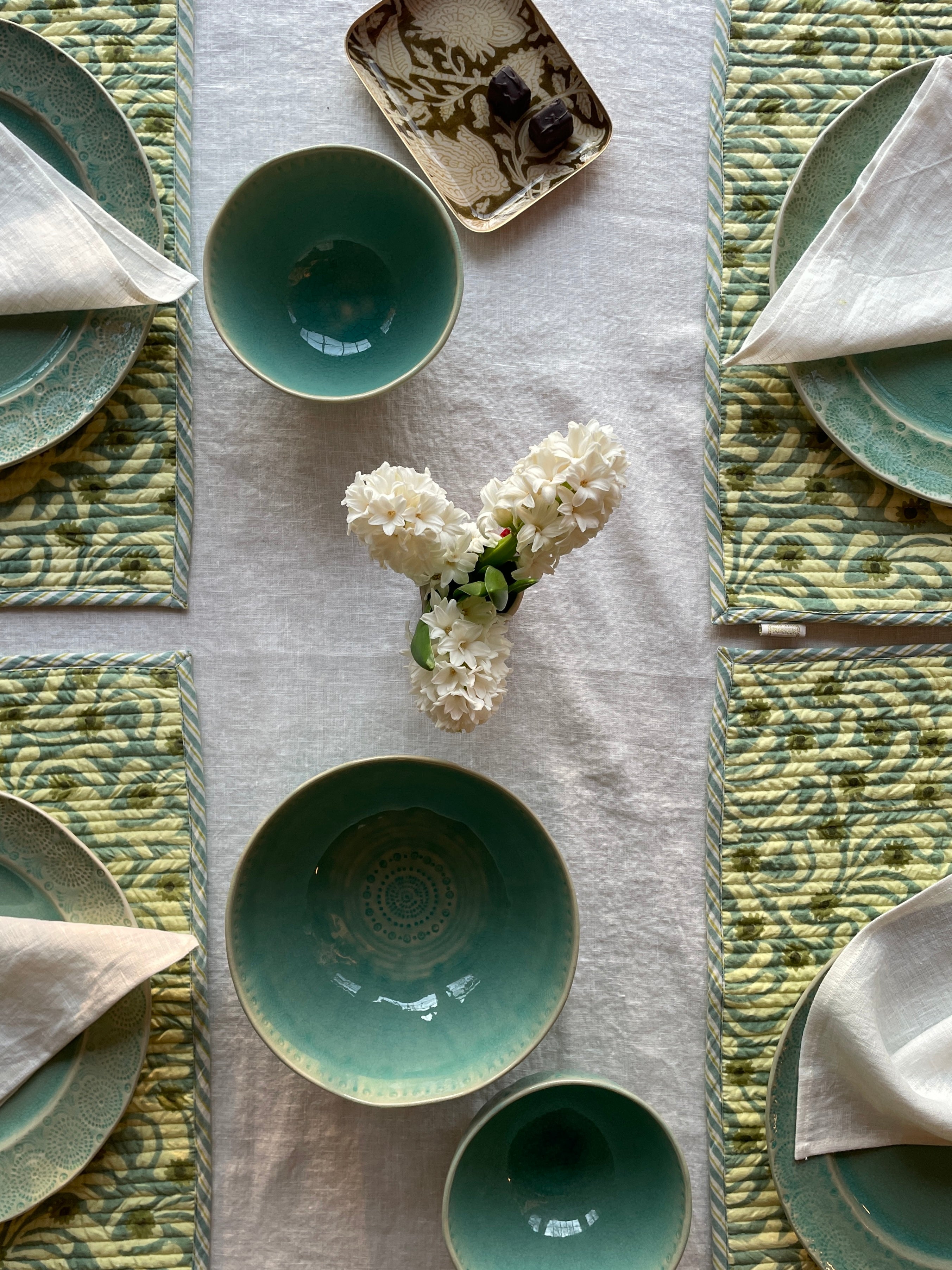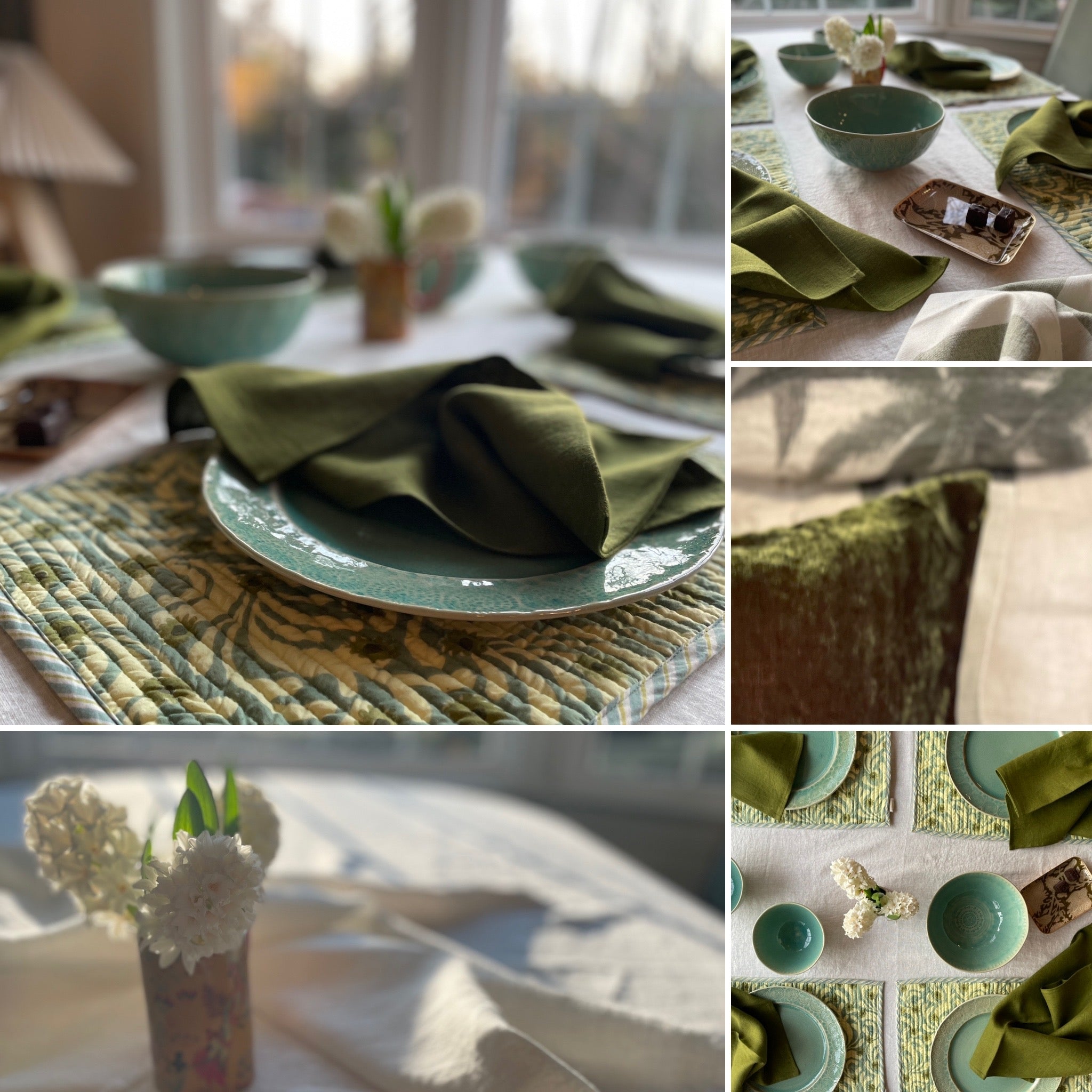 Journeys of cinematic style across East and West on the infamous train the Orient Express inspired this green collection based on the carriage Wes Anderson designed. Read my article in Selvedge magazine 'Train of Thoughts' for more intriguing detail. See link on Homepage. Meanwhile imagine travelling in cinematic style across the world whilst laying the table with these beauties!