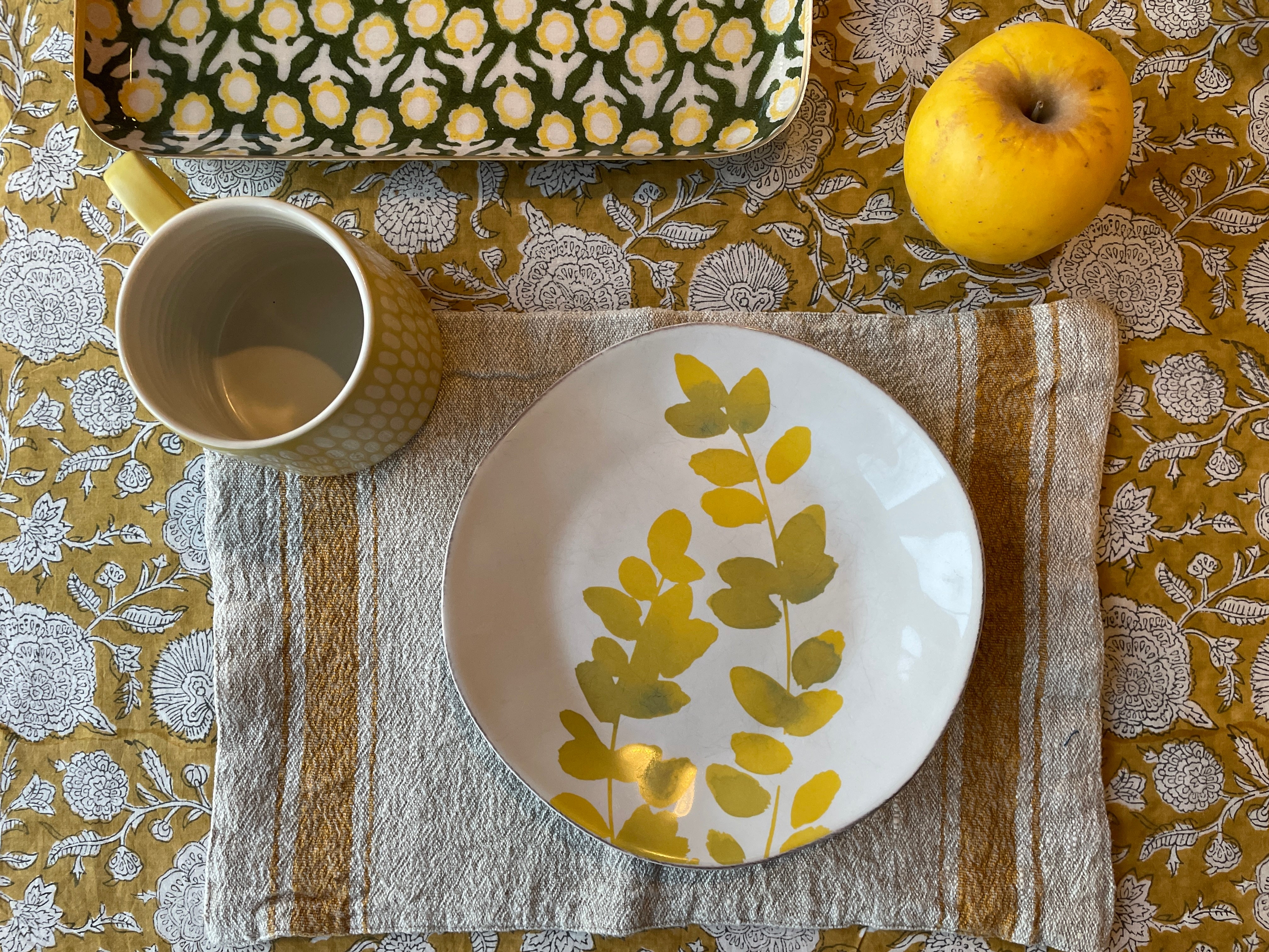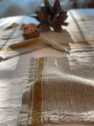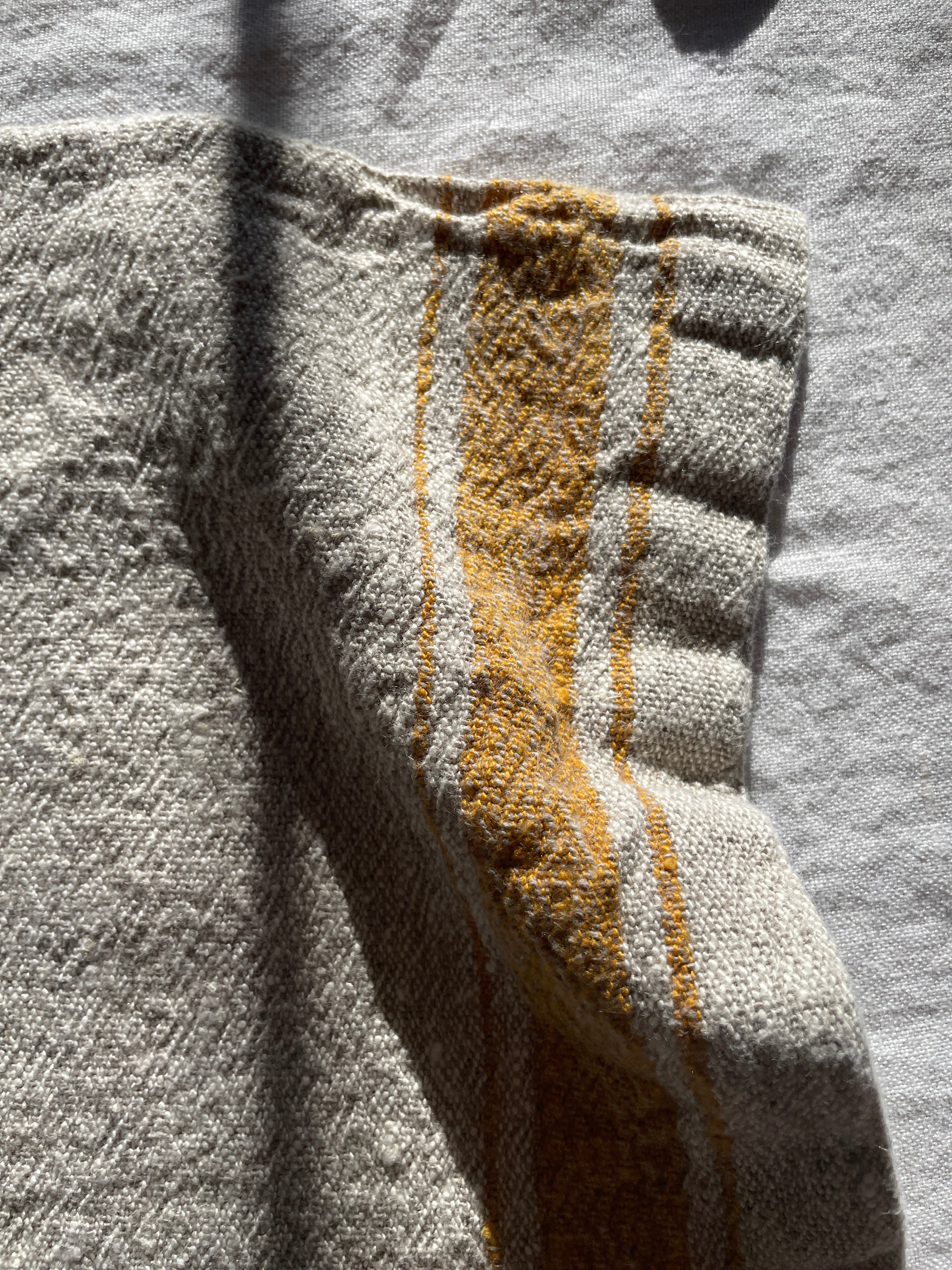 A piece to treasure for a lifetime and more. A super cute and soft heirloom piece in undyed linen with lovely stripe detail. Great with or without a tablecloth. A small placemat that'll make a table feel more inviting and add a touch of cuteness. It's a double layer so really hard wearing. Or just throw it onto a tray, place your dinner on it and eat in style in front of the TV:)