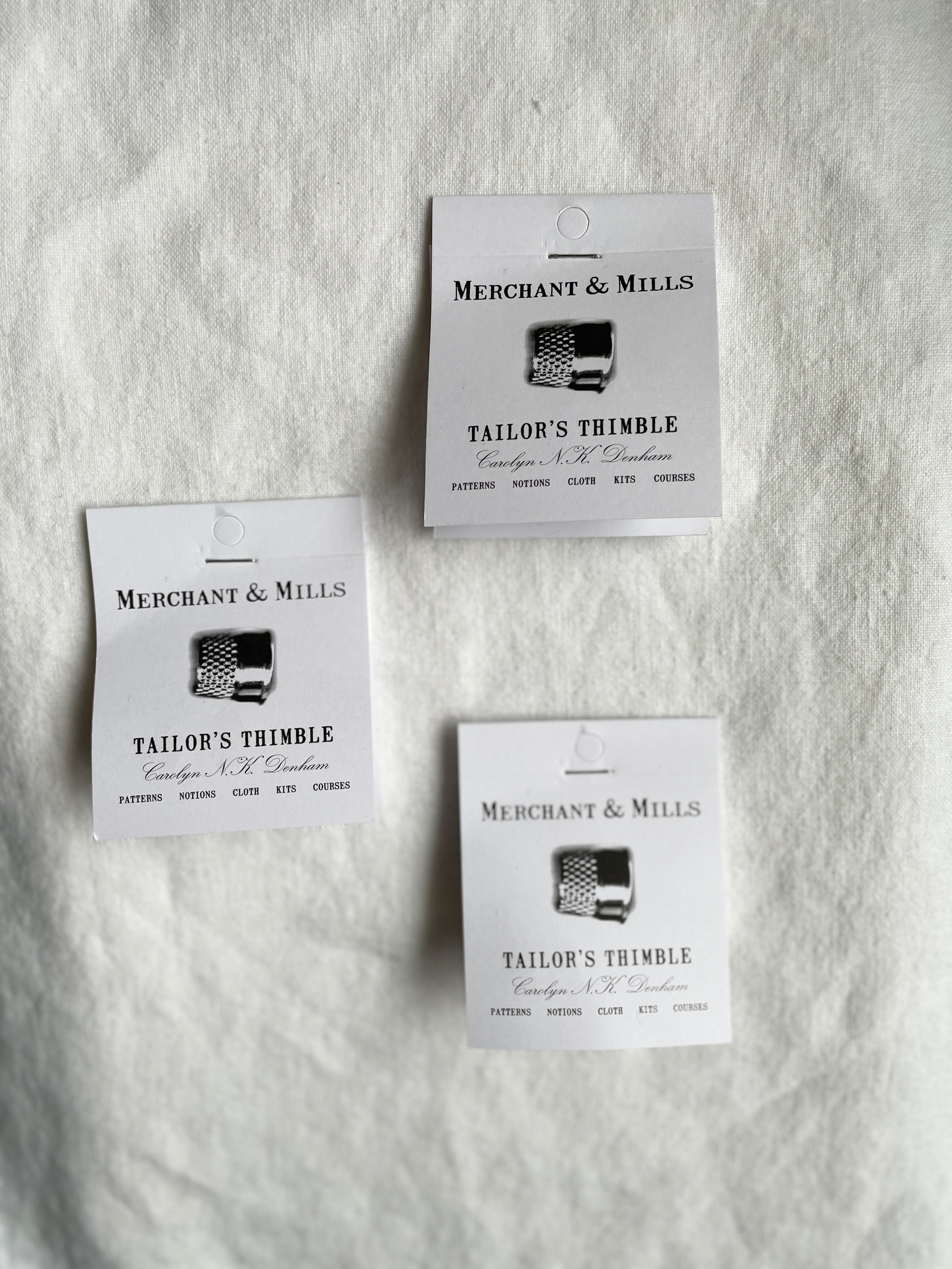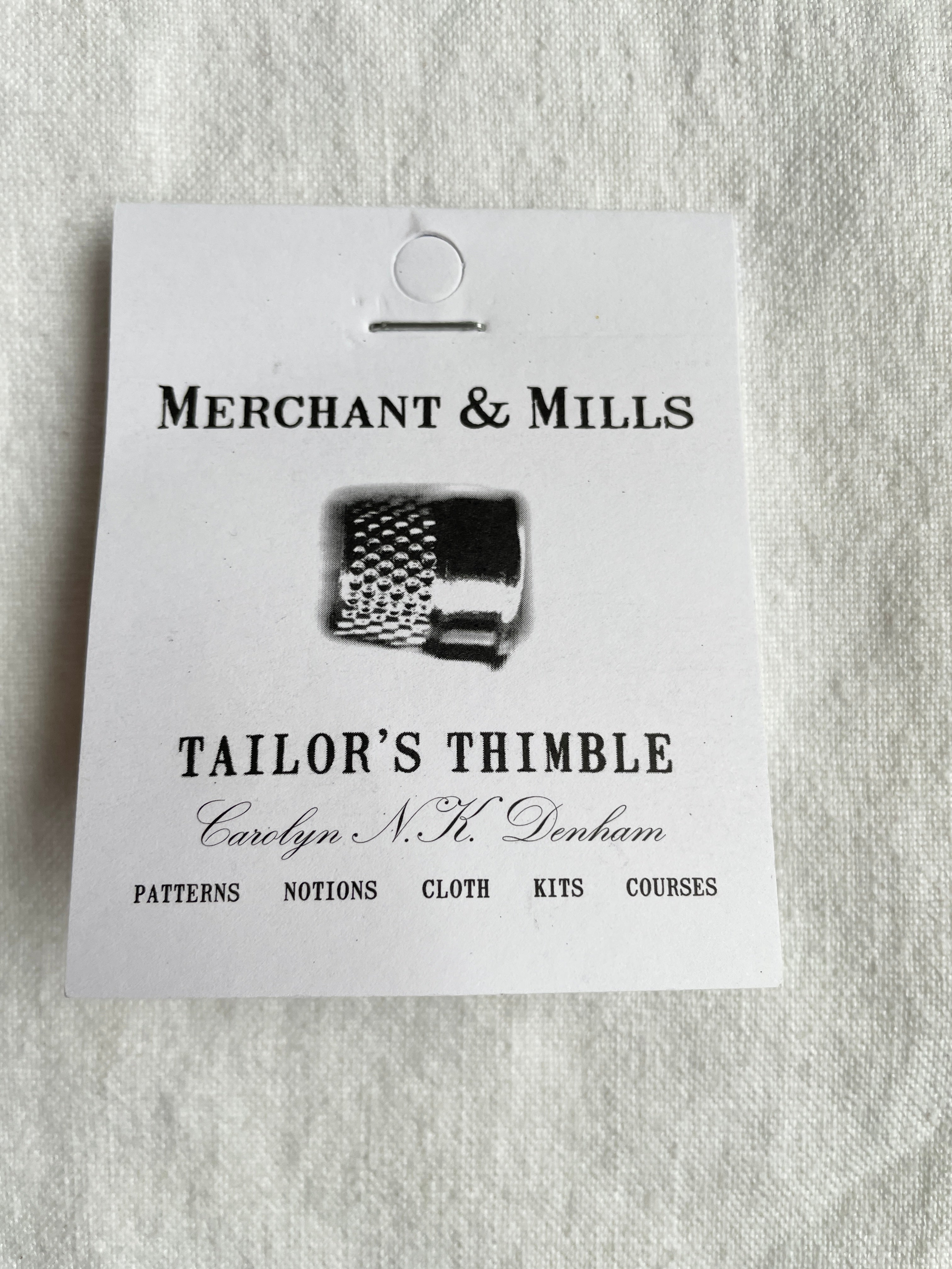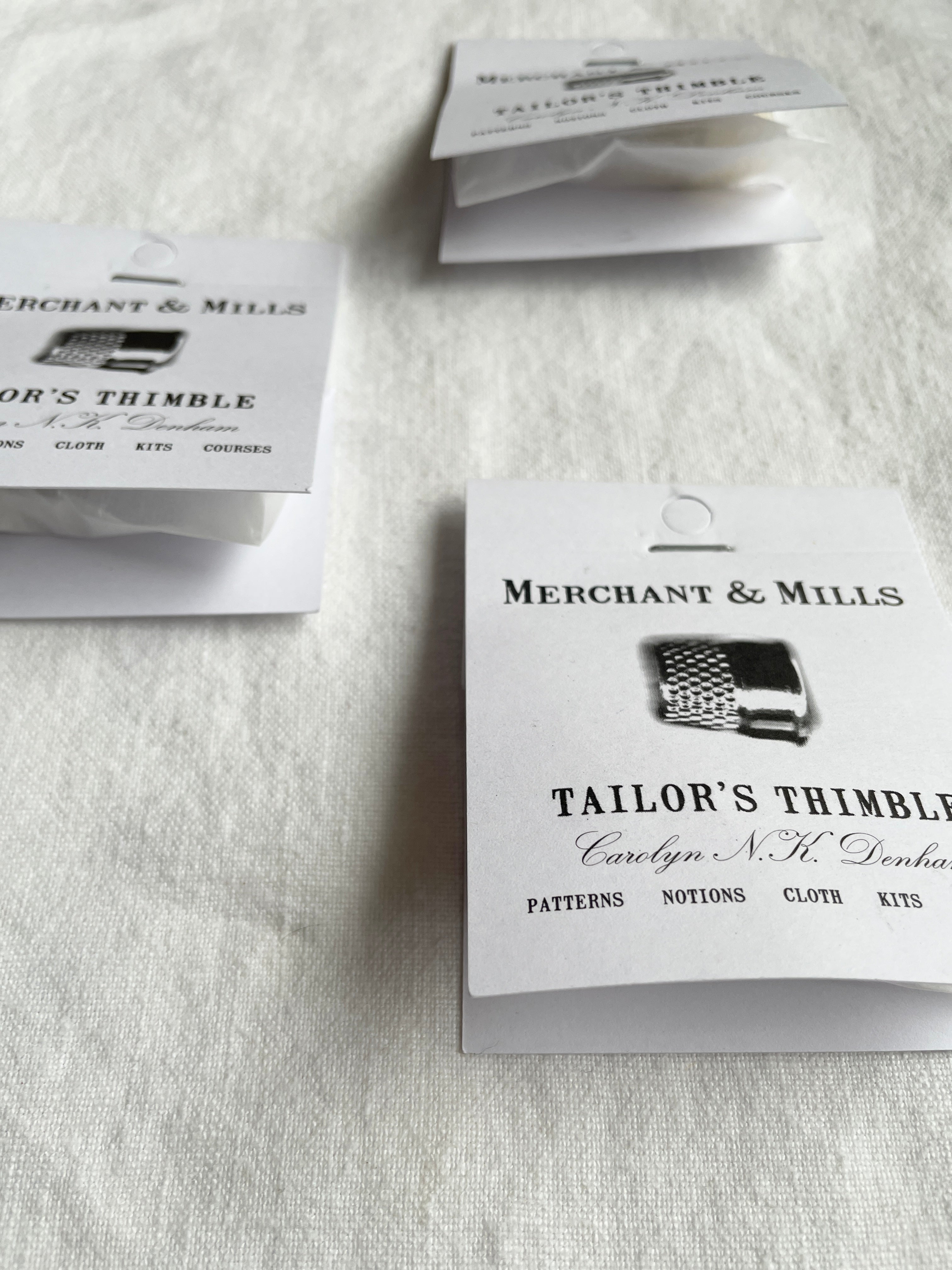 Solid brass tailor's thimble with a hole at the top - with an etched'Merchant & Mills' logo. The capless tailor's thimble, you will notice, has an open top for tactile fabric control. It protects your finger without affecting dexterity. Engineered in Hong Kong. Lacquered to prevent discolouring, size medium.