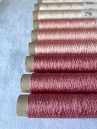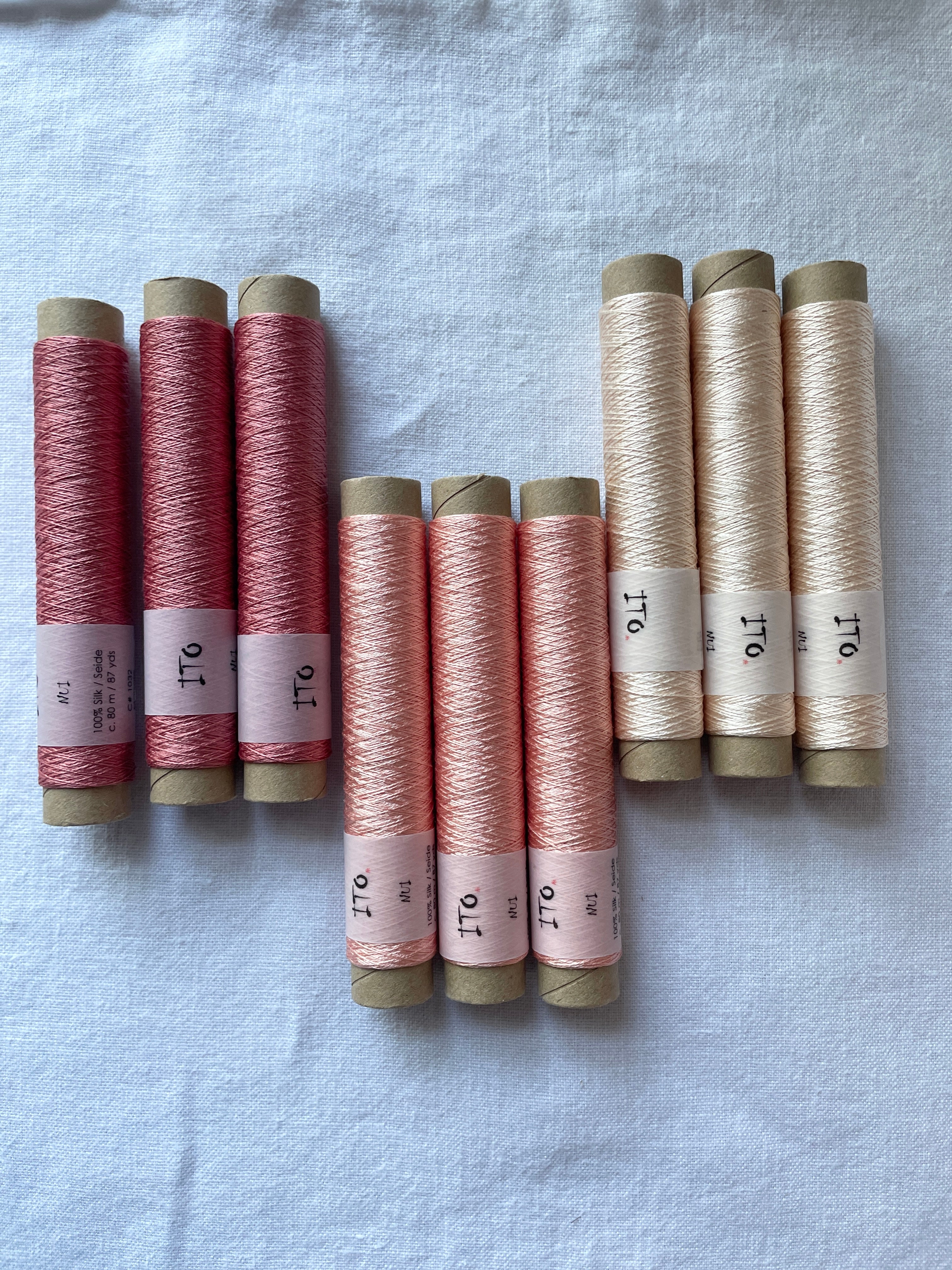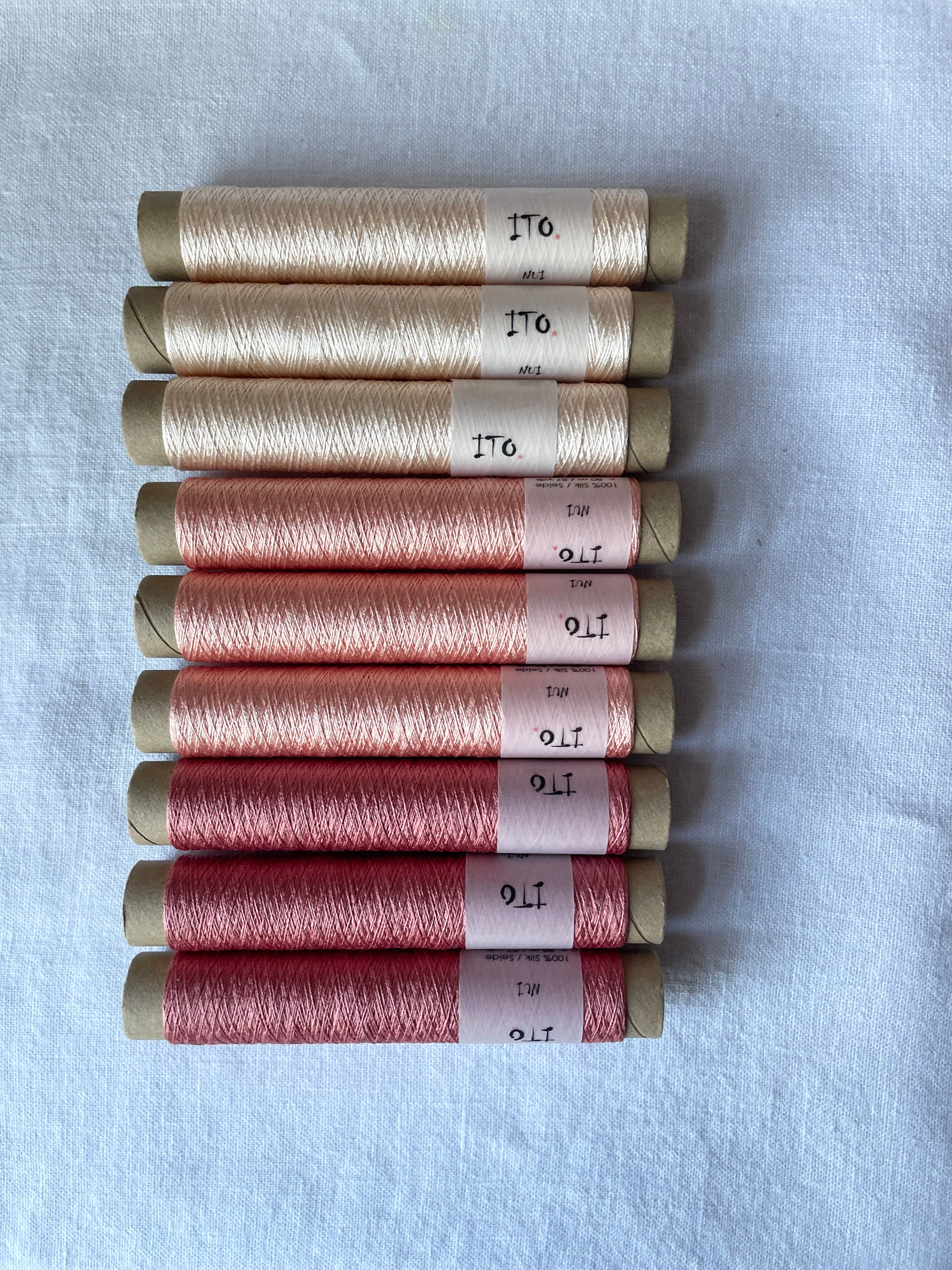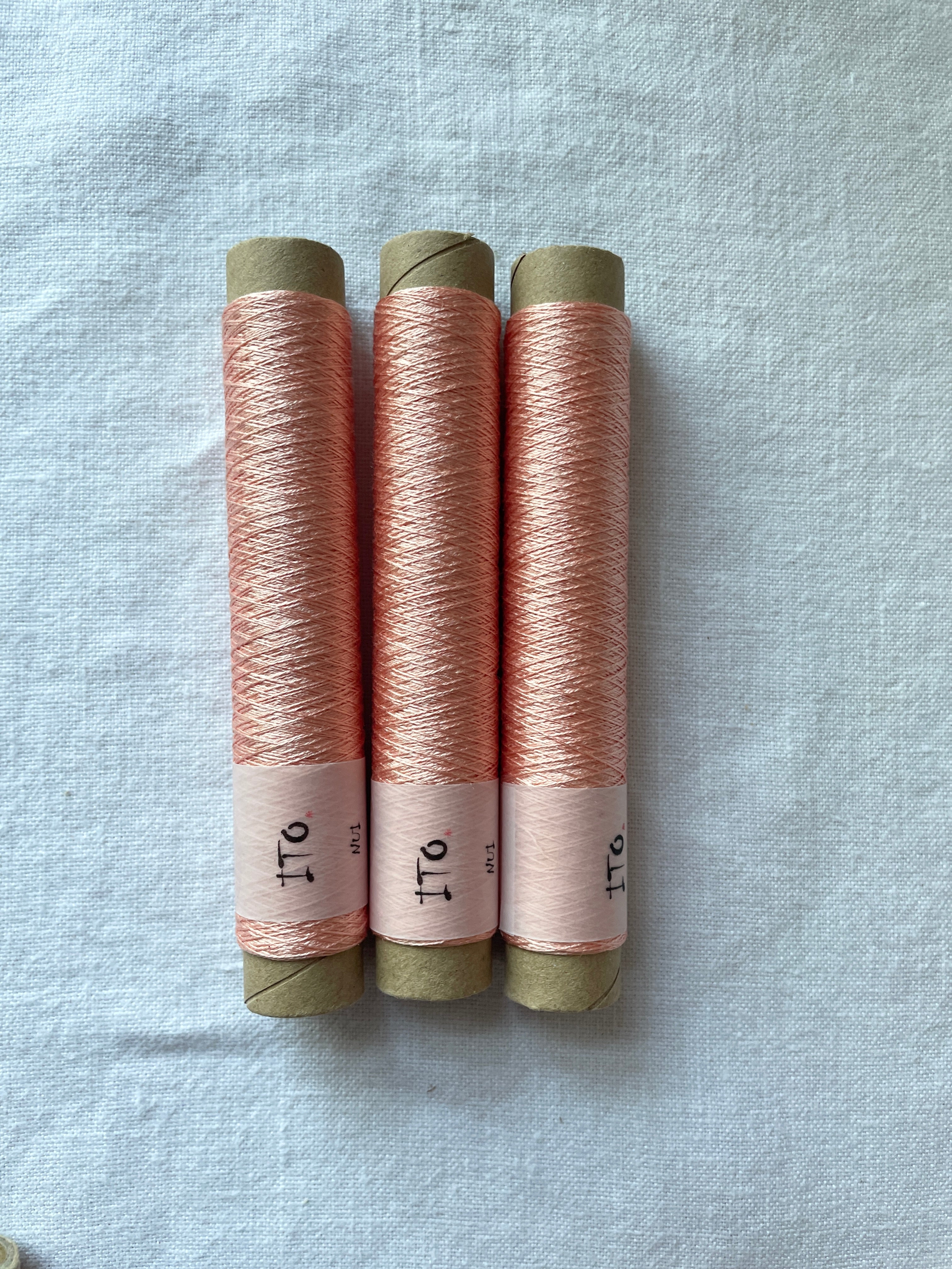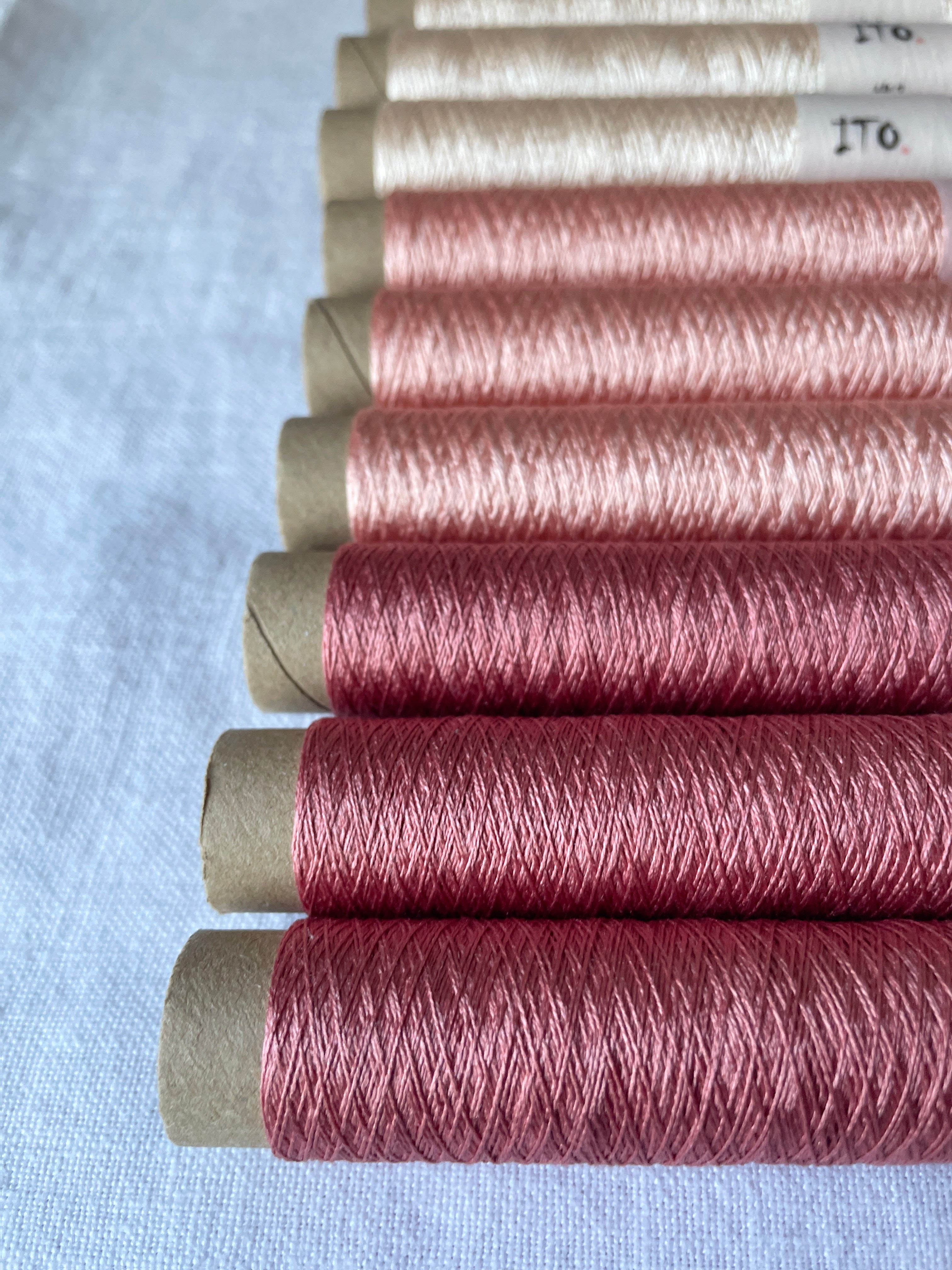ITO Nui is a spun silk thread ideal for sewing, quilting and embroidery. It can be used for both hand work and machine work. The spun silk has a soft sheen. 2 plies are twisted for optimal strength to a thickness of 2/60 NM (30 wt). The glossy, slightly pearly texture lends itself beautifully to surface designs like quilting, free motion embroidery, applique, top stitching or outlining. ITO Nui will give strong seams to sewing projects and is a sustainable alternative to polyester thread.