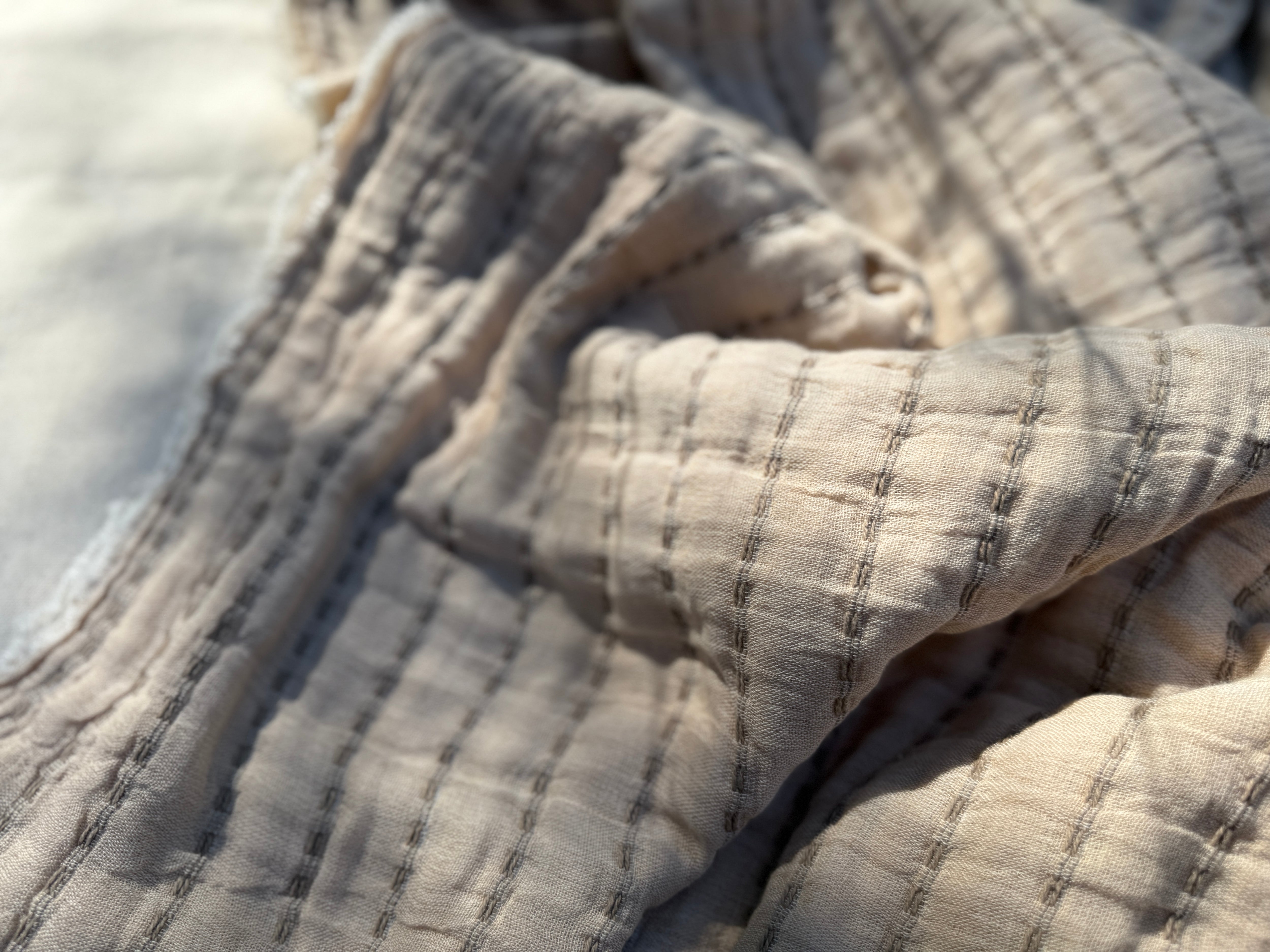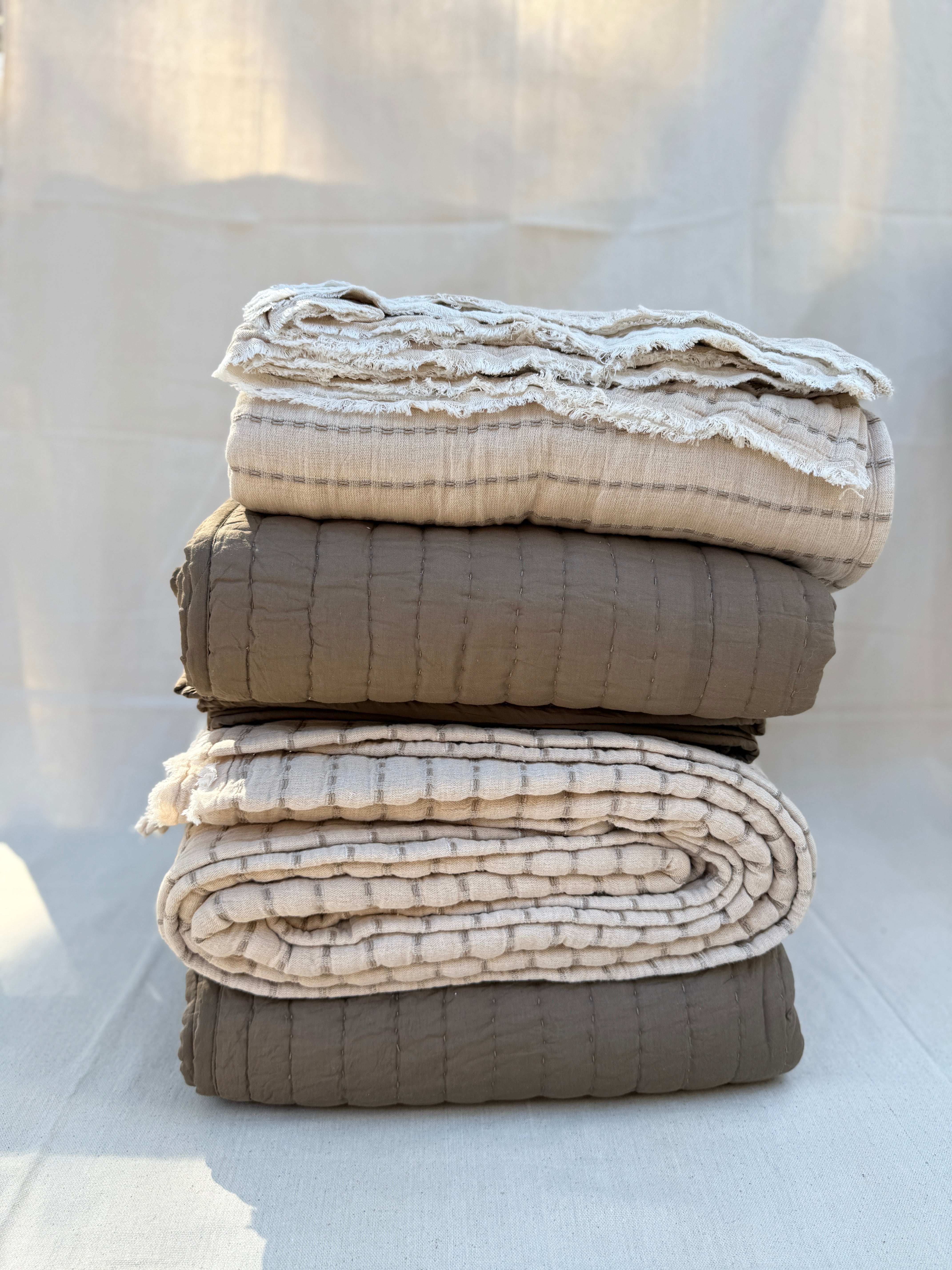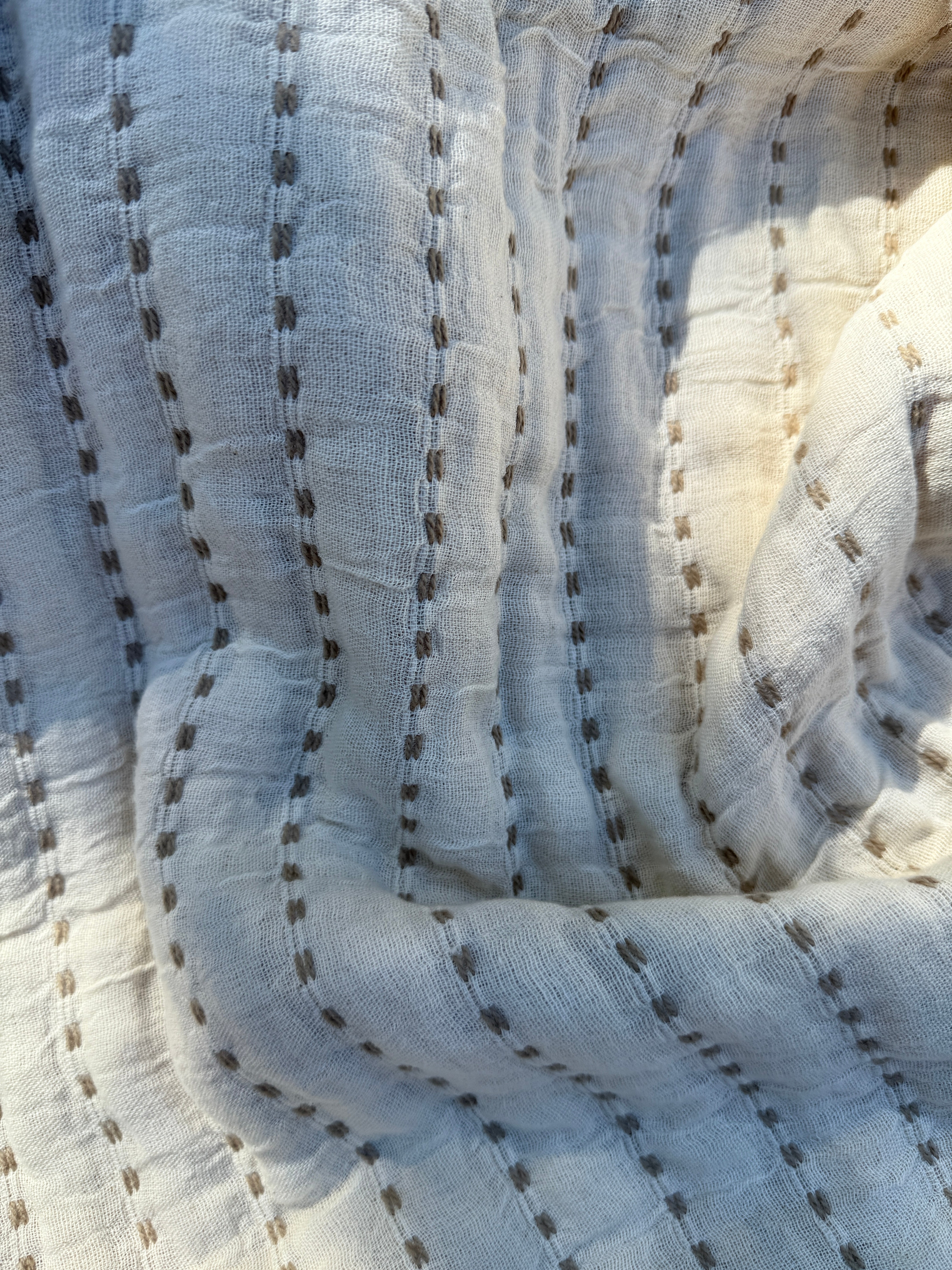 Add charm and the soulful touch of craftsmanship to your slumber quality with this gorgeous double gauze super soft Biscuit Quilt. The reversible two sided color/ pattern with intricate hand embroidery adorning it, makes it a must have essential. Wrap it around on cold nights, take it with you anywhere when travelling!